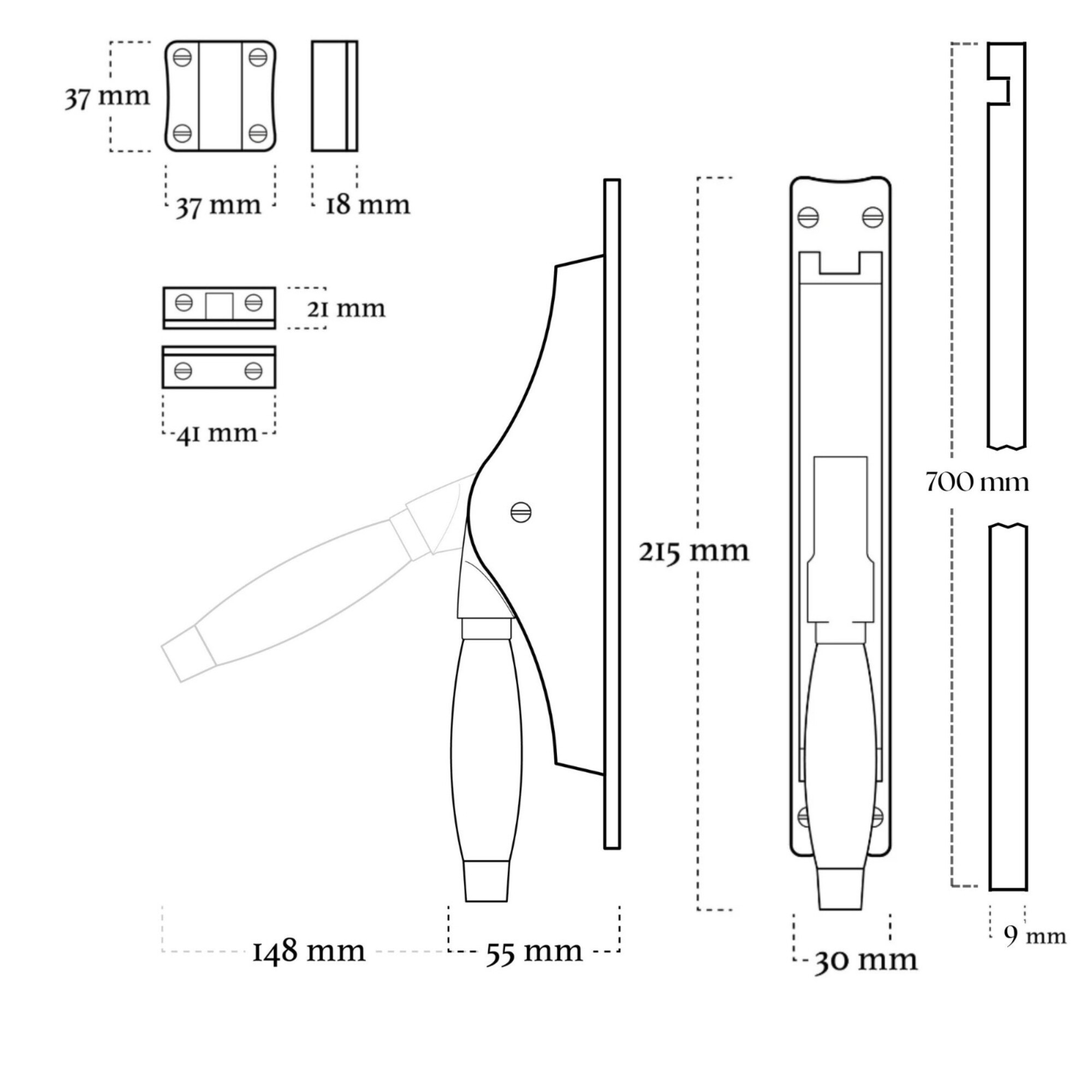 De handgreep is gemaakt van massief eikenhout, een dichte hardhoutsoort met een fijne nerfstructuur. De natuurlijke kleurschakeringen van licht- tot donkerbruin geven elke espagnolet een uniek karakter. Eikenhout voelt warm aan en is van nature slijtvast.